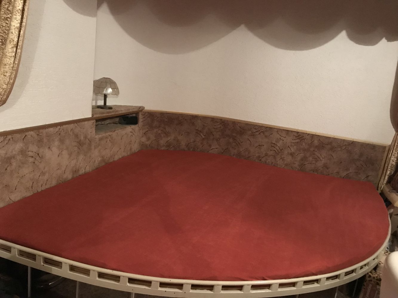 Prostěradlo ve tvaru výseče kruhu do výklenku v bytě. Zhotovené z pružného materiálu FROTÉ.