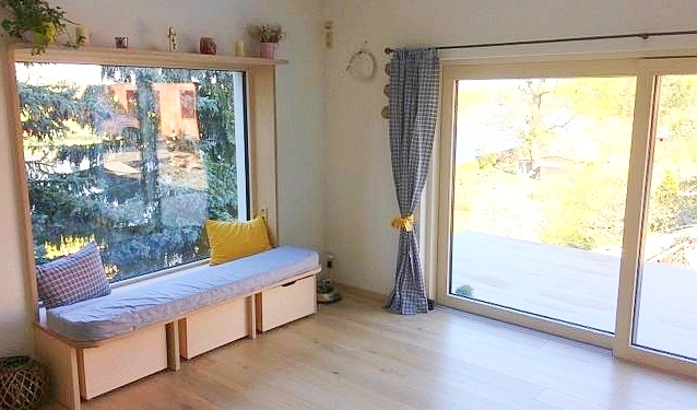Závěsy na okna jsou ušité k kanafasu, zavěšení je řešené na ouška. Ozdobná mašle ze žluté látky slouží ke svázání.